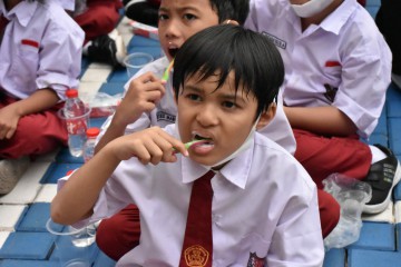 Peringatan Hari Kesehatan Gigi Nasional (HKGN) 2022 wilayah Jakarta Timur digelar di SDN 05 Malaka Jaya, Kelurahan Malaka Jaya, Kecamatan Duren Sawit, Jakarta Timur, Senin (12/9/2022). Dalam kegiatan itu, sebanyak 1264 siswa Sekolah Dasar (SD) ikut berpartisipasi dalam sikat gigi massal.